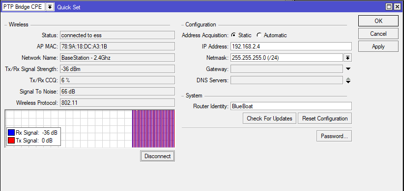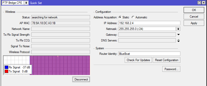 @tony-white Please help, I am experiencing a similar problem while trying to reset the BlueBoat’s router to factory settings and apply the configuration file in accordance with the zip manual. I could successfully reset the BaseStation through WinBox and could ping it on a laptop, no lags or any problem. When trying to reset the boat’s router, I could press on “Remove Configuration“ button in WinBox but it exited the further configuration menu. After that I kept trying to connect to the router via its mac address, its IP showing 0.0.0.0 and identity name being “Mikrotik“, but it wouldn’t connect at all. Oftentimes I am not even able to see the device on the list when connecting to the laptop (or it appears after a long wait time). I tried connecting both via the Ethernet adapter from the kit and via Ethernet port directly, didn’t observe any difference. I am now stuck and don’t know what to do.
