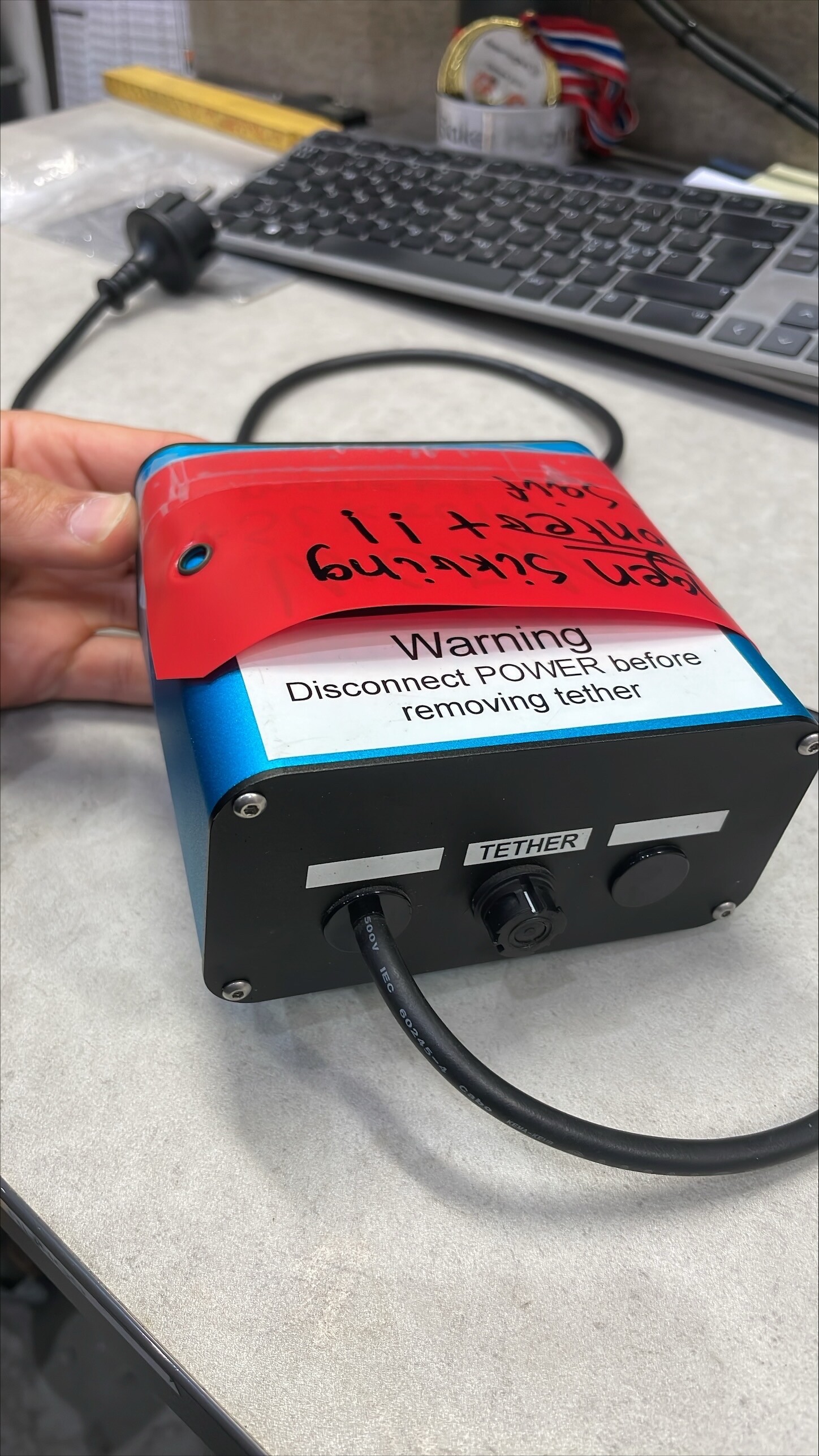 It’s possible that your tether has been damaged, and the wires in it are shorting together - making an electrical connection where there shouldn’t be one. This would cause fuses to blow quickly though, which doesn’t match your failure.