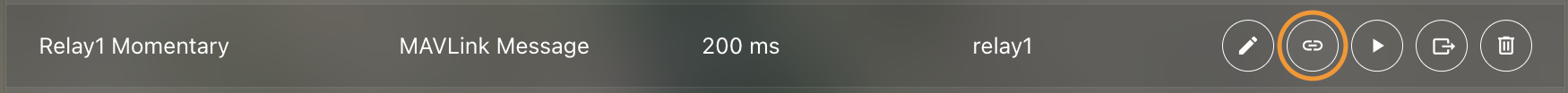 Settings / Actionsand set up two separate custom MAVLink message Actions, for on and offMAV_CMD_DO_SET_RELAYcommands (using theCOMMAND_LONGmessage type)- Relays in MAVLink are 0-indexed, so Relay 1 is controlled by 0 in parameter 1